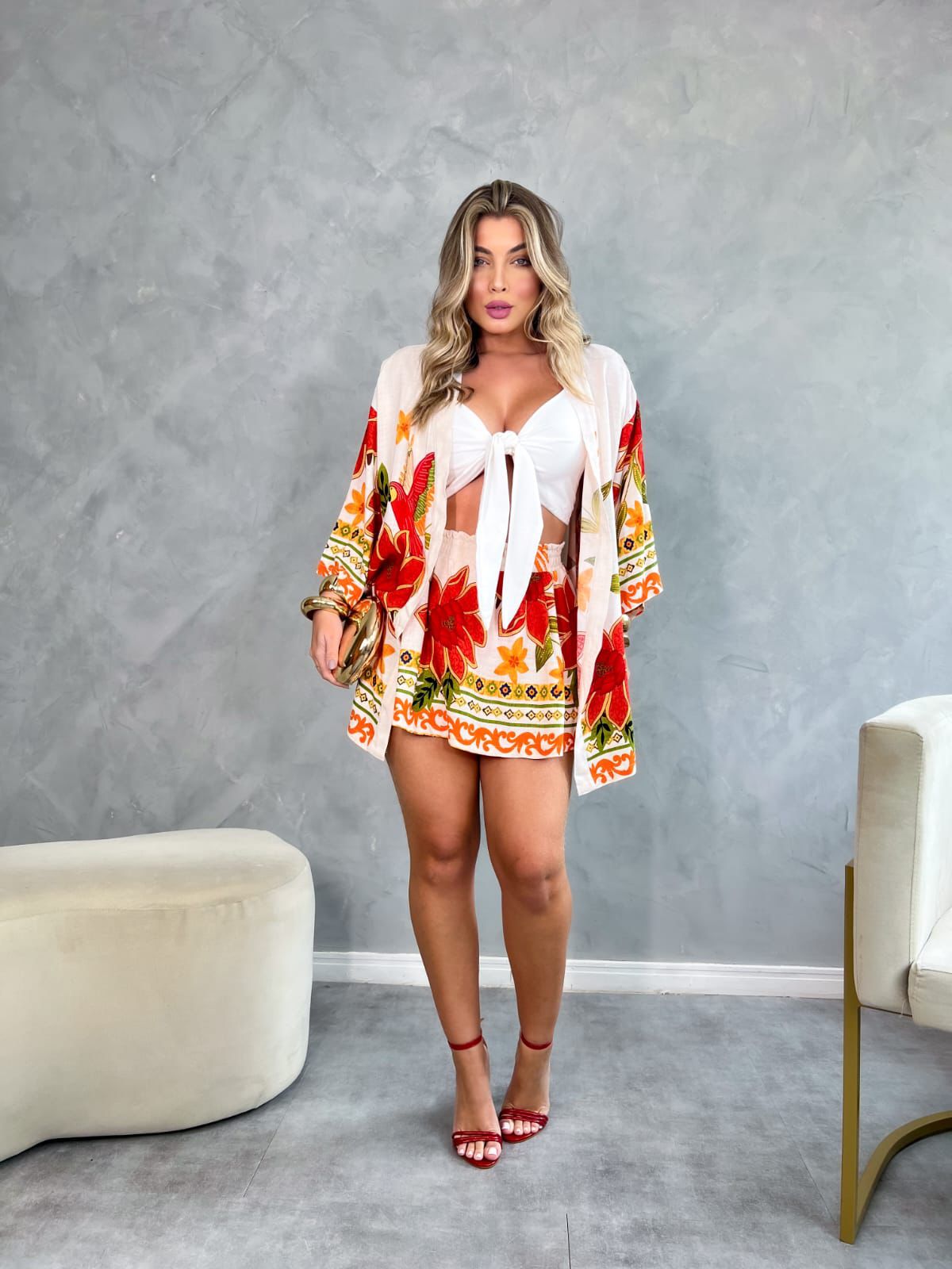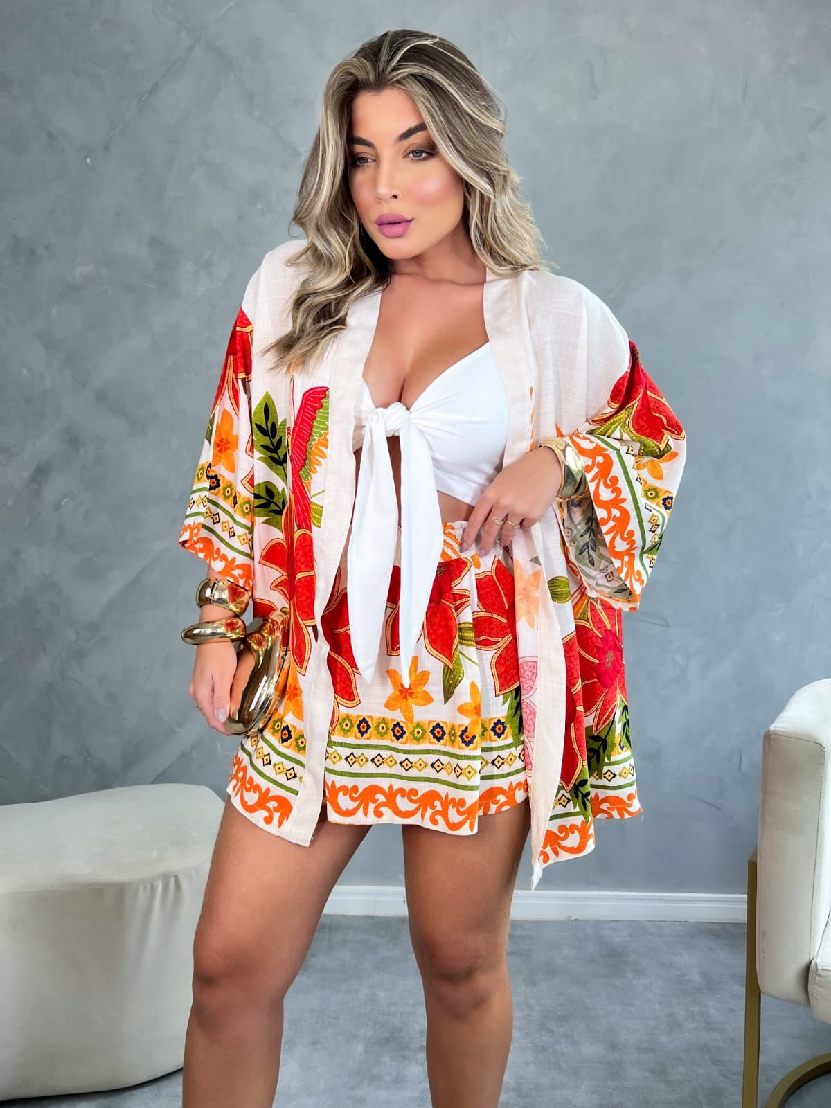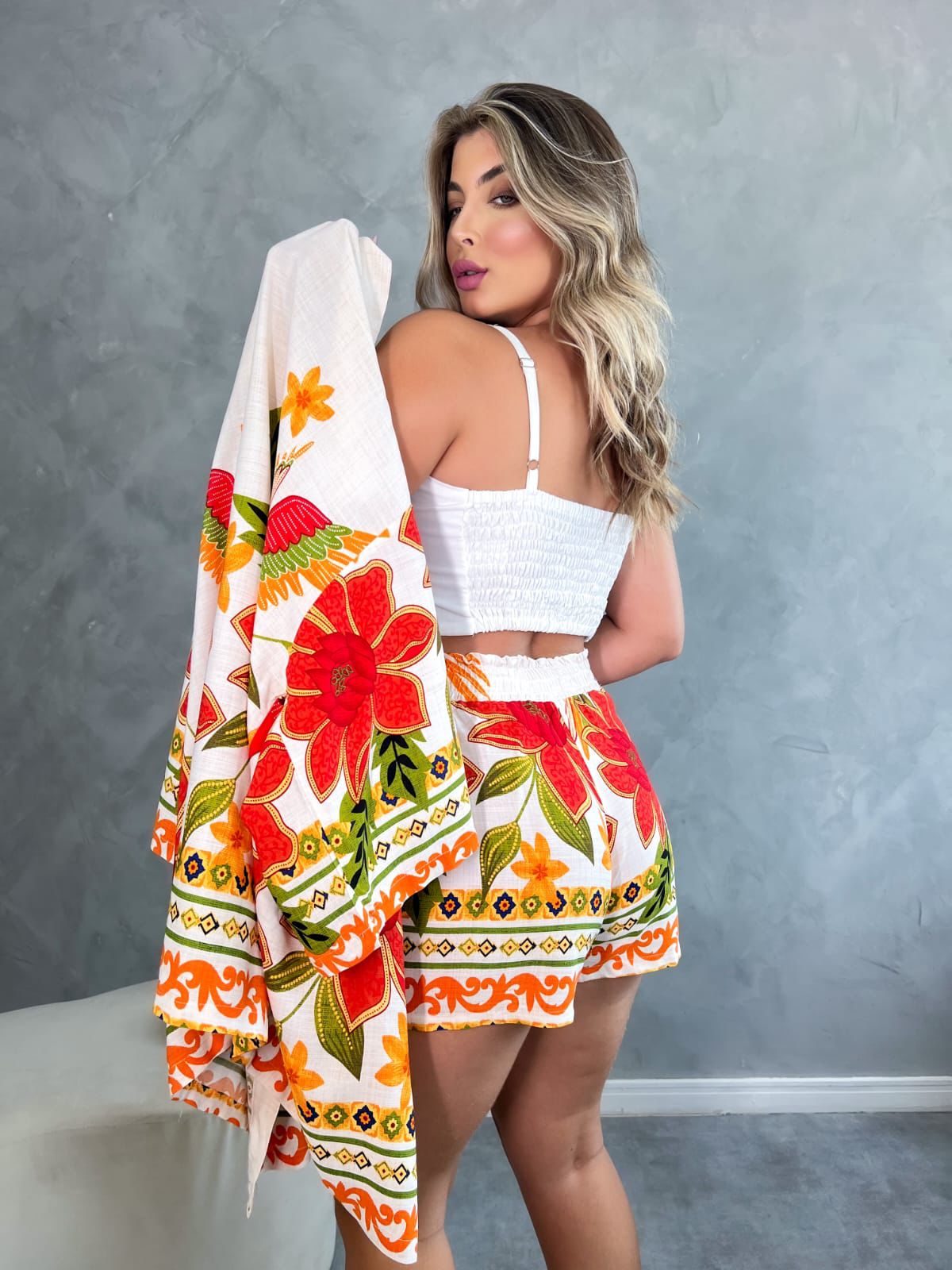 Conjunto Kimono e Short saia! Se você quer arrasar com um visual moderno e confortável, chegou a sua hora! Esse conjunto é como um buffet de estilo: você pode usar tudo junto ou separado.