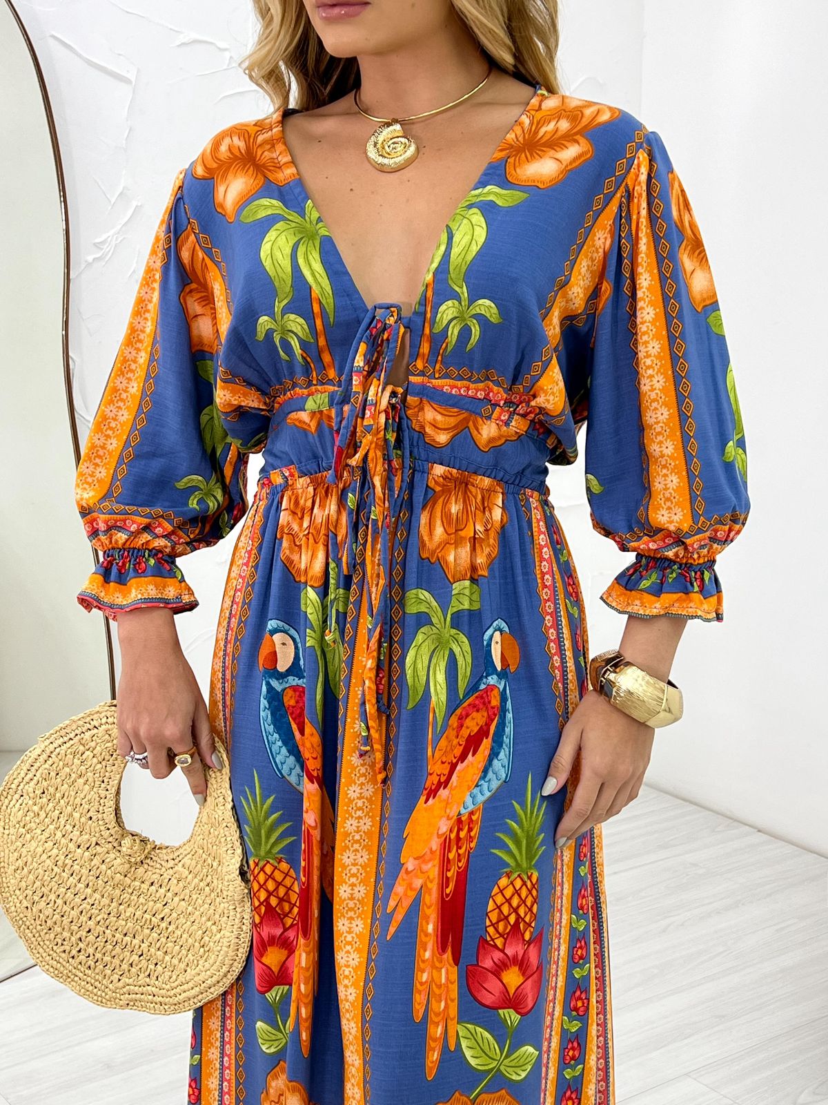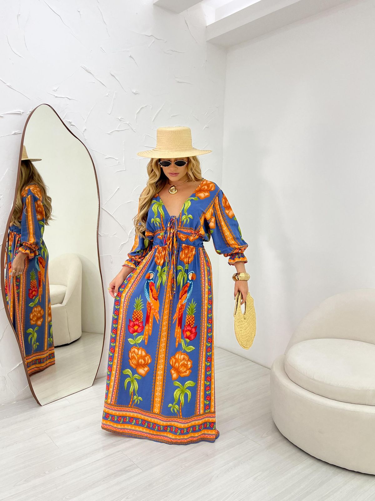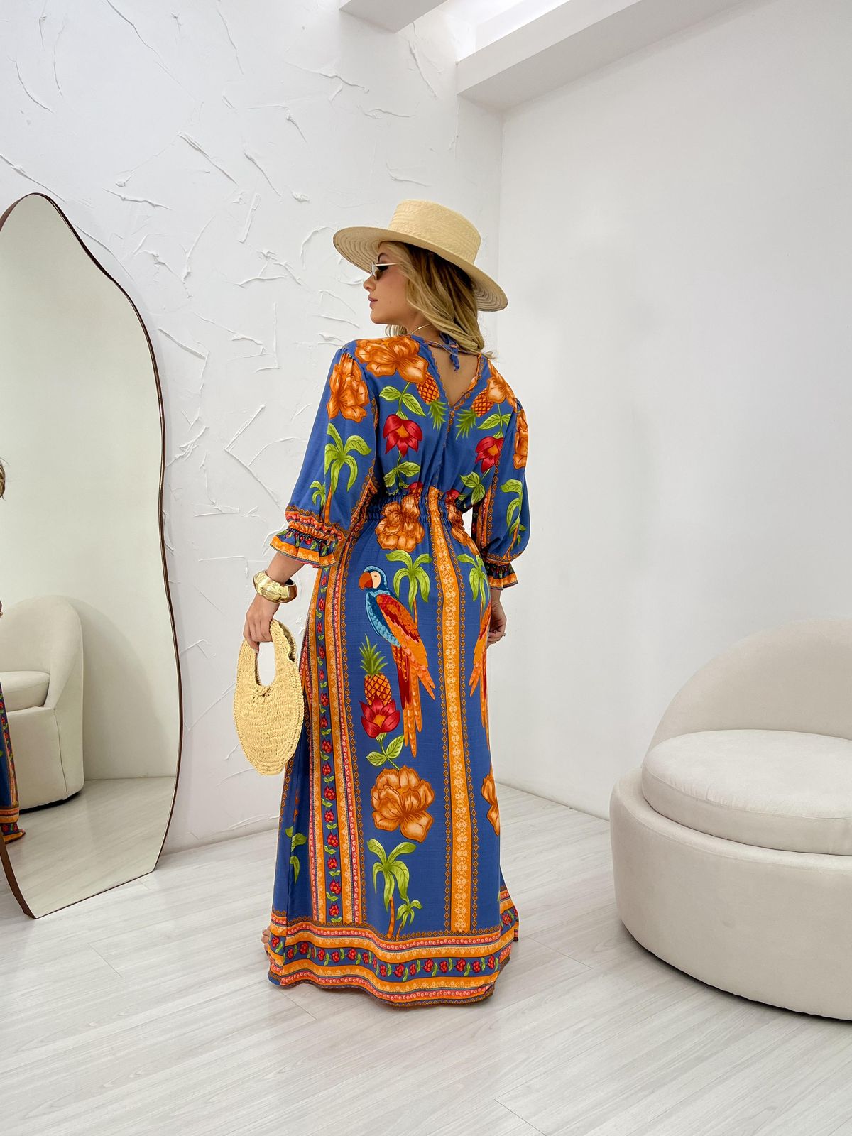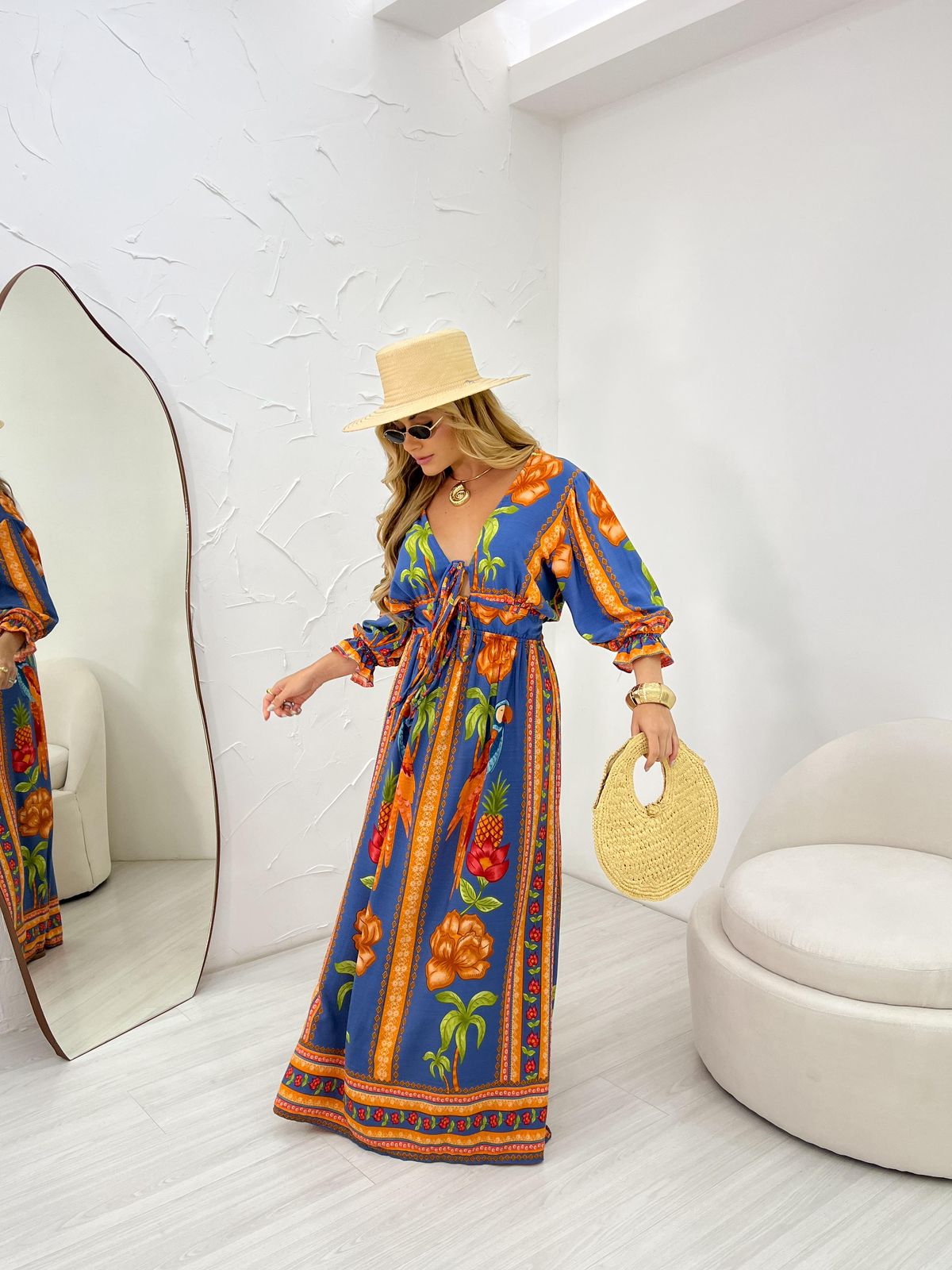 Encante-se com a leveza e sofisticação do nosso vestido longo estampado! Confeccionado em tecido viscolinho, fluido e de toque suave, esse modelo traz uma estampa vibrante com flores tropicais, folhagens e detalhes em laranja que criam um contraste incrível com o fundo azul royal. O decote em V com amarração central valoriza o colo, enquanto as mangas 3/4 bufantes com elástico nos punhos proporcionam um toque romântico e elegante. Ideal para ocasiões ao ar livre, viagens ou eventos durante o dia. Combine com chapéu de palha e acessórios dourados para um look resort perfeito!